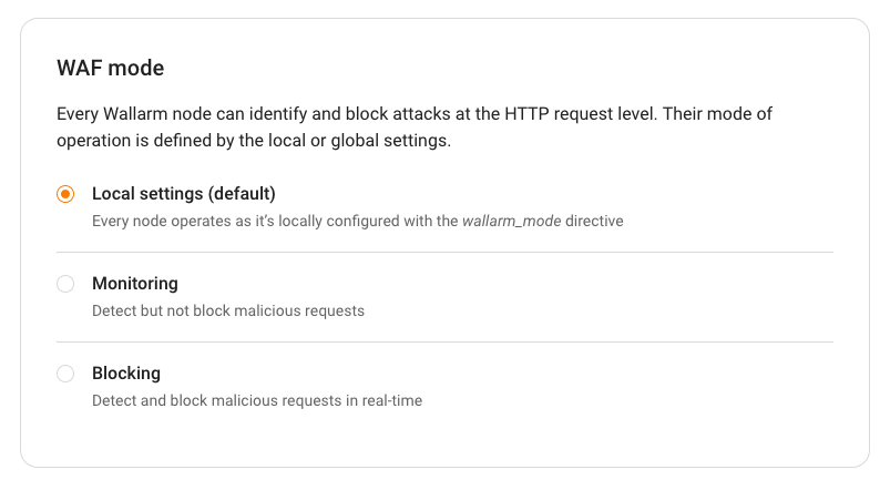 directive. By default, the settings specified in Wallarm Console have a higher priority than the wallarm_mode