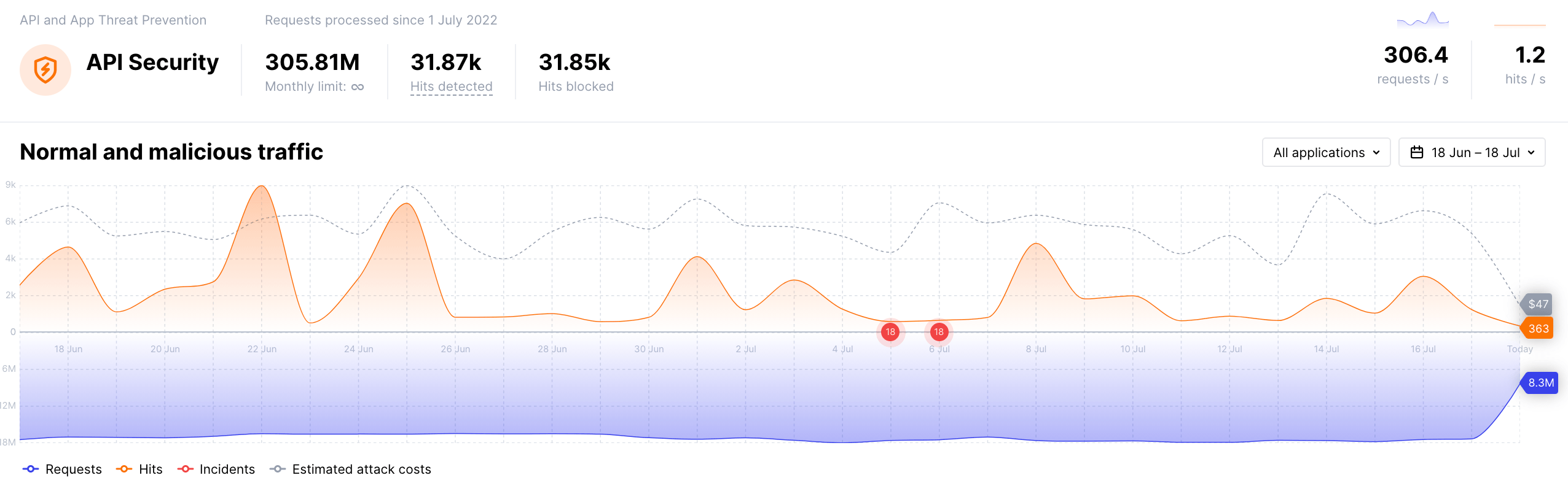 The Dashboards section on your Wallarm account shows the event history's graphs and metrics of the system, as well as the current status of resources. Data is displayed on two dashboards: