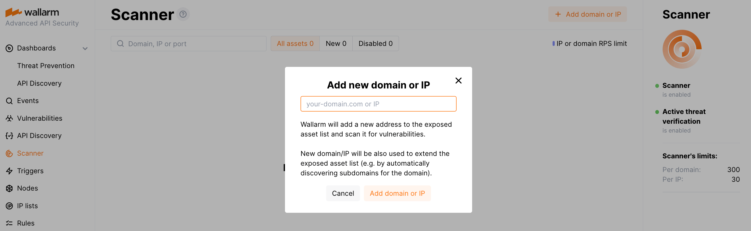 To trigger Wallarm to discover your company's exposed assets, add the first public asset manually. Click Add domain or IP and enter one of your domains or IPs: