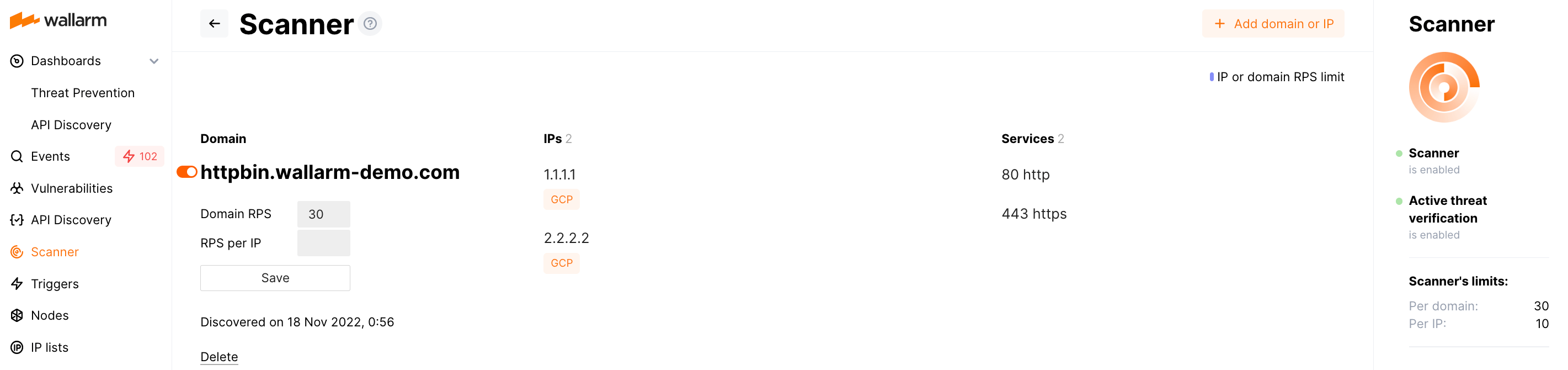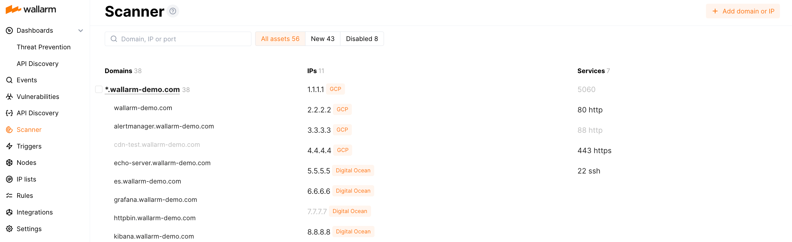 The Scanner section of Wallarm Console allows you to see all of your public assets, such as domains, IP addresses, and ports, that have been automatically discovered by Wallarm Scanner.