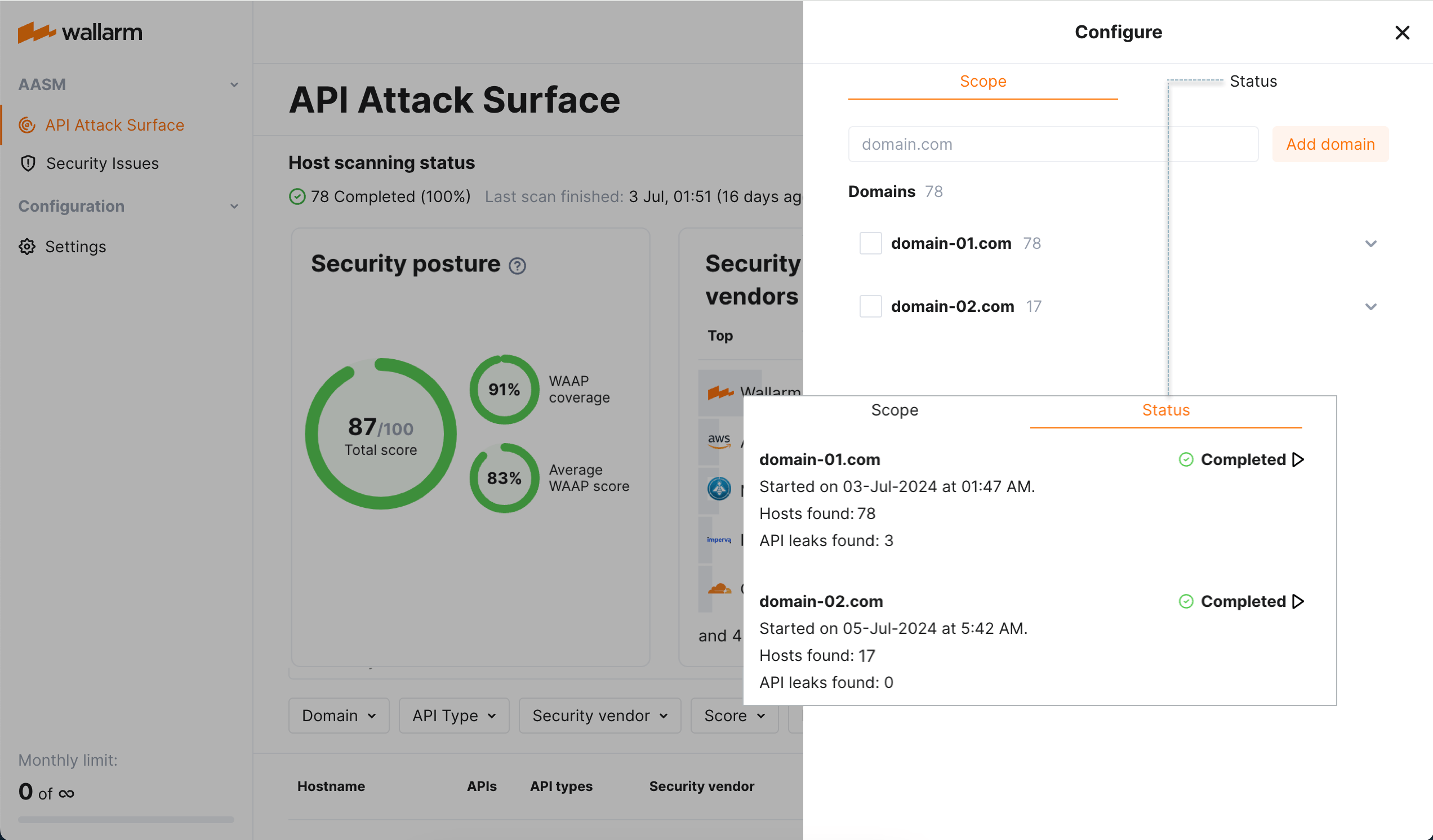 Once subscription is activated, to configure domain detection and start searching for security issues, in Wallarm Console → AASM → API Attack Surface or Security Issues section, click Configure. Add your domains to the scope, check the scanning status.