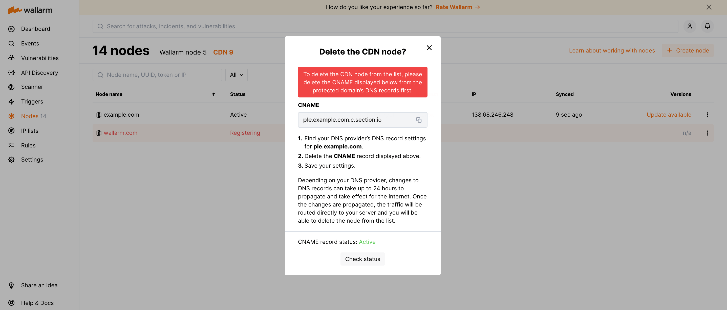 Wait for the changes to be propagated. The actual CNAME record status is displayed in Wallarm Console → Nodes → CDN → Delete node.