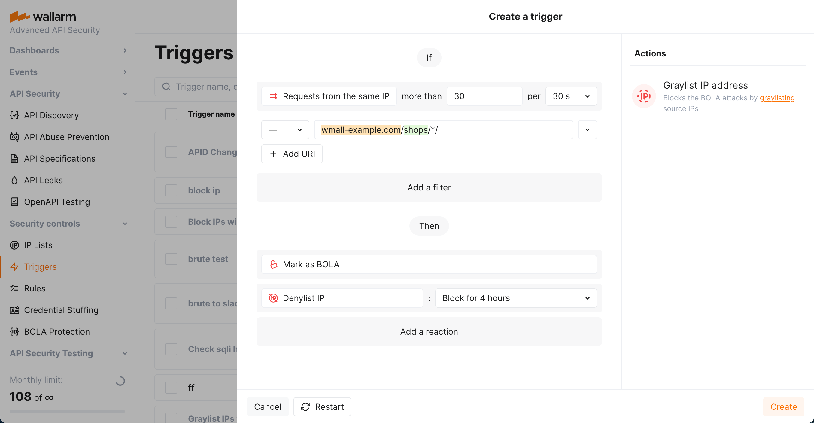 trigger reaction. Wallarm will put origin IP to the denylist after the threshold is exceeded and block all further requests from it.Note that even if the bot IP is placed into the denylist by manual BOLA protection, by default, Wallarm collects and displays statistics regarding blocked requests originating from it.