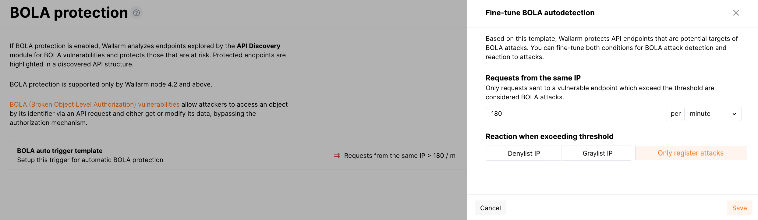 Only register BOLA attacks in the event list when the threshold of requests from the same IP is reached. Wallarm does not block BOLA attacks. Requests will keep going to your applications.