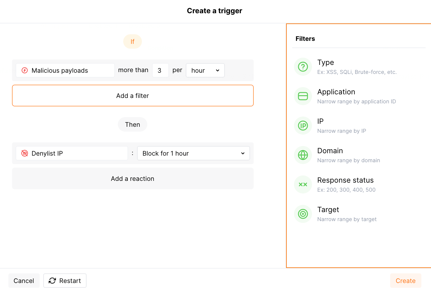 trigger reaction. Wallarm will put origin IP to the denylist after the threshold is exceeded and block all further requests from it.Note that even if the bot IP is placed into the denylist by multi-attack protection, by default, Wallarm collects and displays statistics regarding blocked requests originating from it.