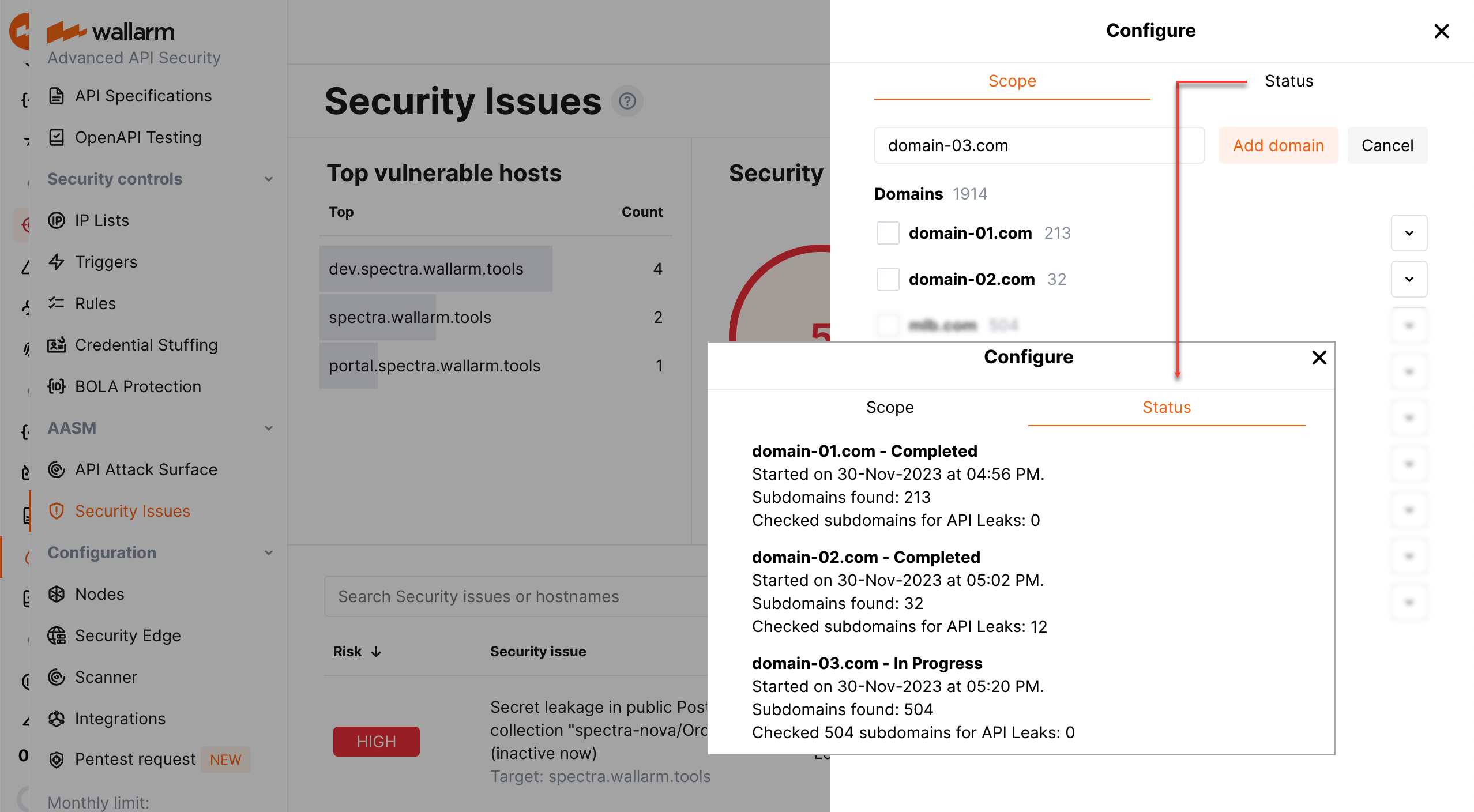 Wallarm will start searching for subdomains and leaked credentials published under the domain. The search progress and results will be displayed at the Status tab.