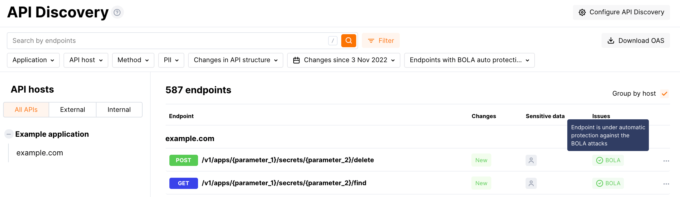 Potential targets of the BOLA attacks are endpoints with variability. Wallarm can automatically discover and protect such endpoints among the ones explored by the API Discovery module.