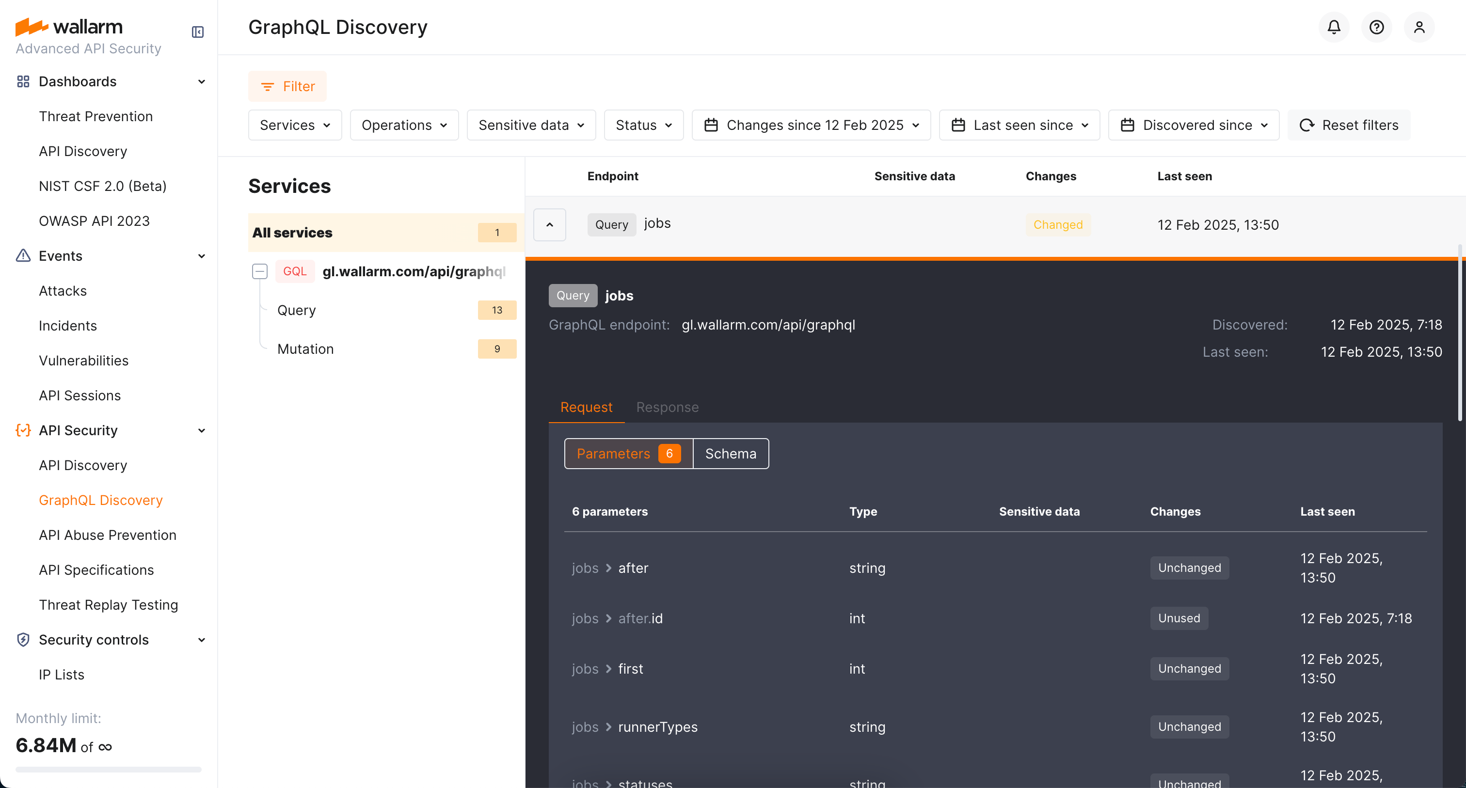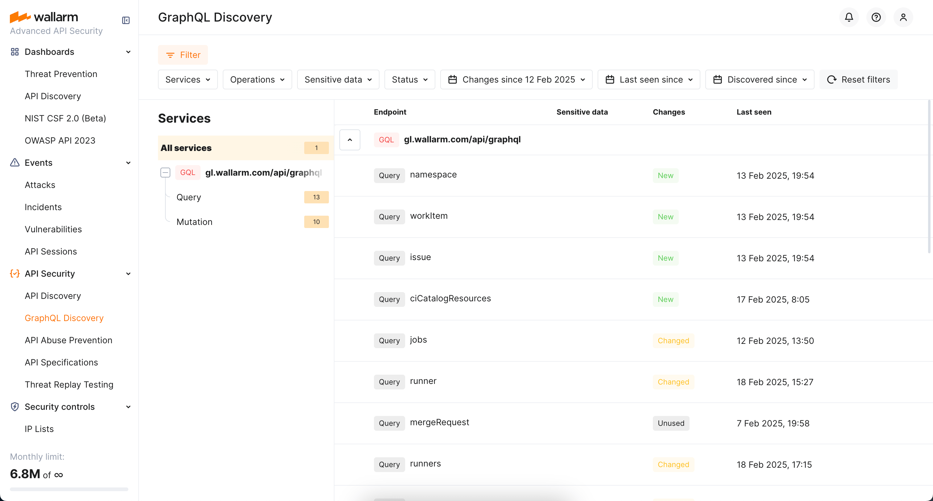 Explore your discovered GraphQL API inventory (services, endpoints and their operations) using the GraphQL Discovery section in the US or EU Cloud.