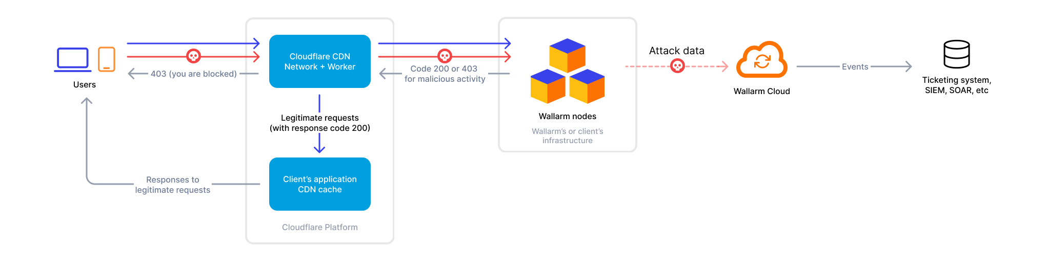 To use Wallarm as a connector for Cloudflare, you need to deploy the Wallarm Node externally and run a Cloudflare worker using the Wallarm-provided code to route traffic to the Wallarm Node for analysis.