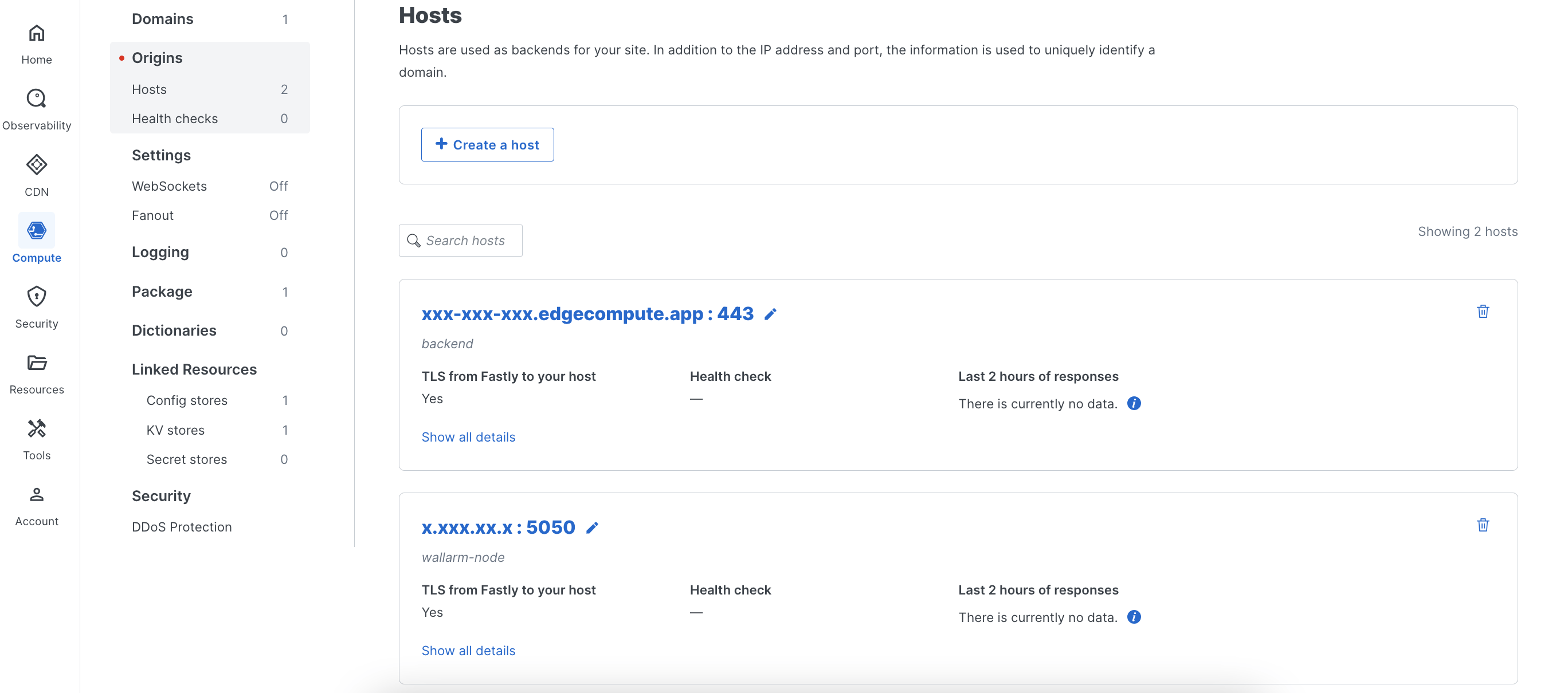 For proper traffic routing for analysis and forwarding, you need to define the Wallarm Node and backend hosts in the Fastly service configuration:
