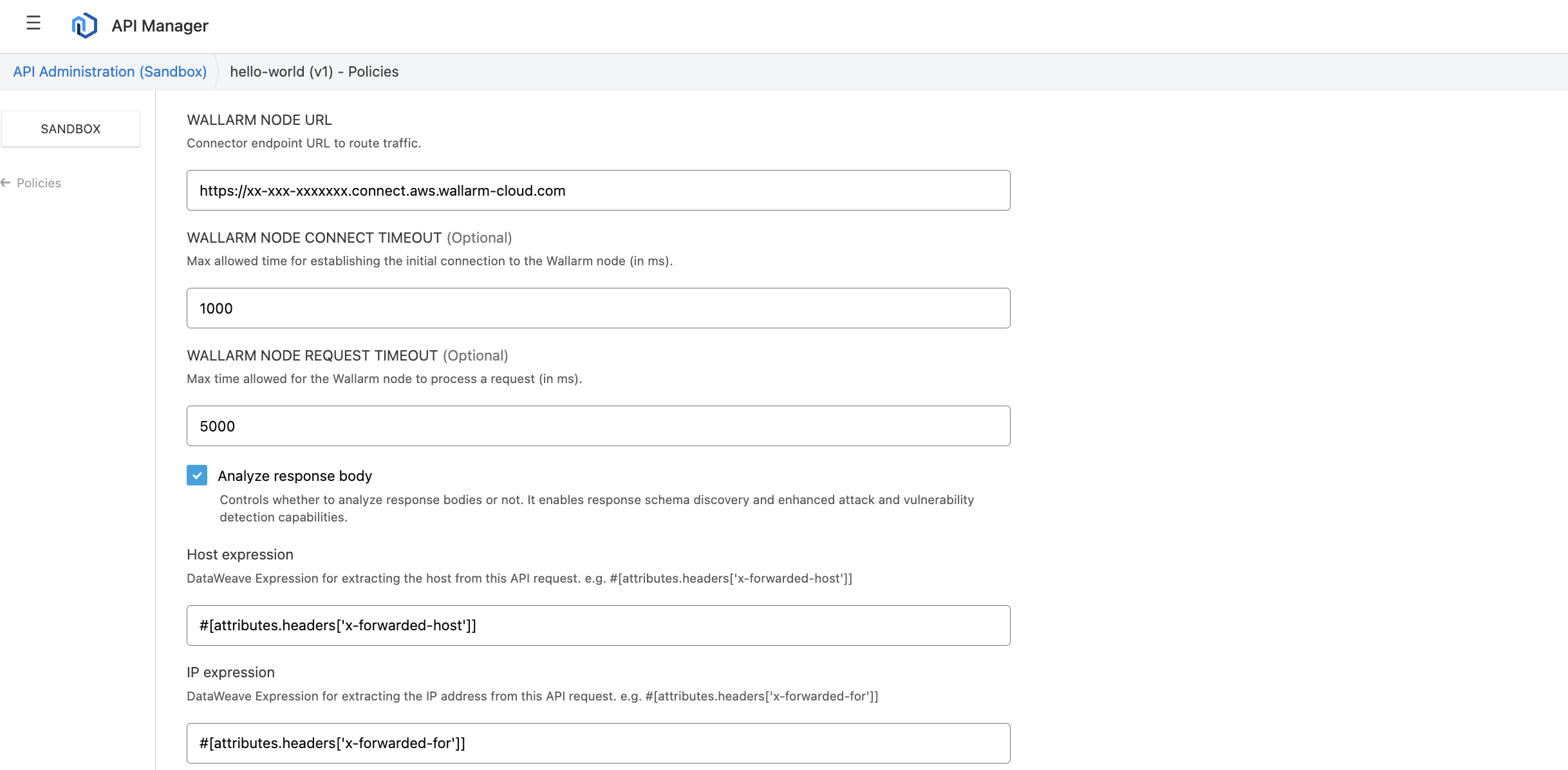 Download the updated Wallarm policy and upload it to Mulesoft Exchange, as described in Step 2.
