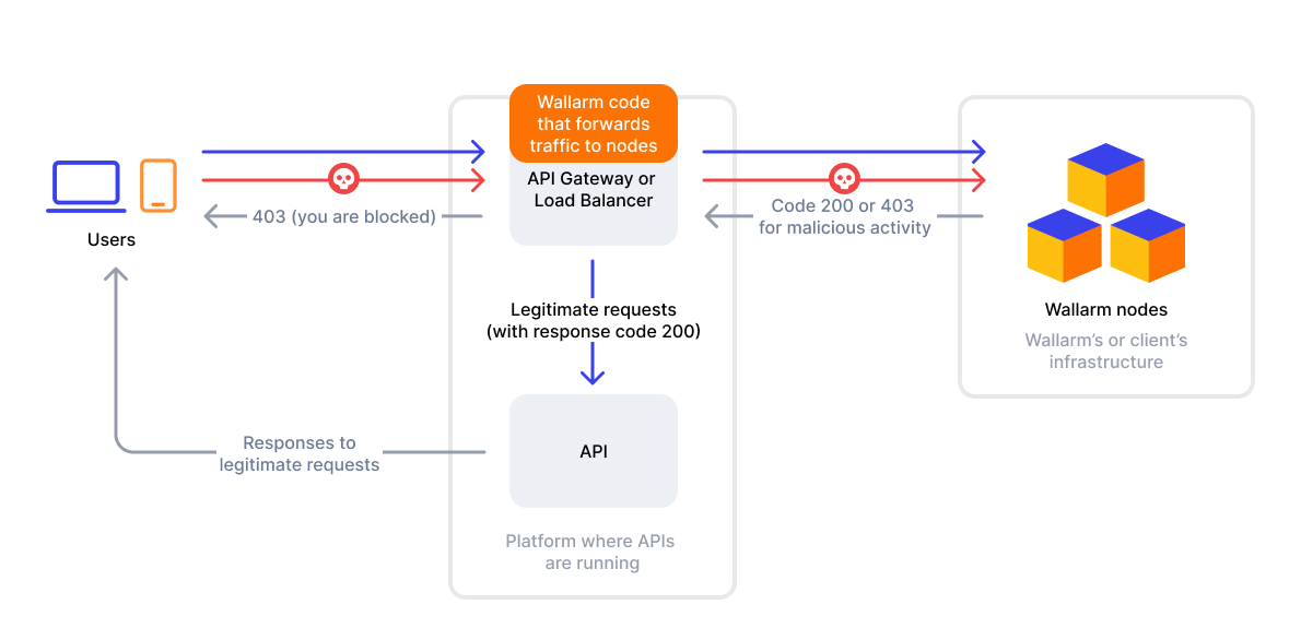 The Wallarm node, hosted either by Wallarm or the client, performs traffic analysis and security checks.